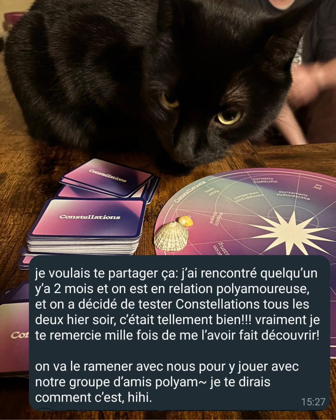 Constellations est un jeu de cartes co-créé par Eva Chancé et Maï-Lys Dermy Regad avec plus de 200 situations réelles et une Galaxie des Émotions sous forme de plateau.