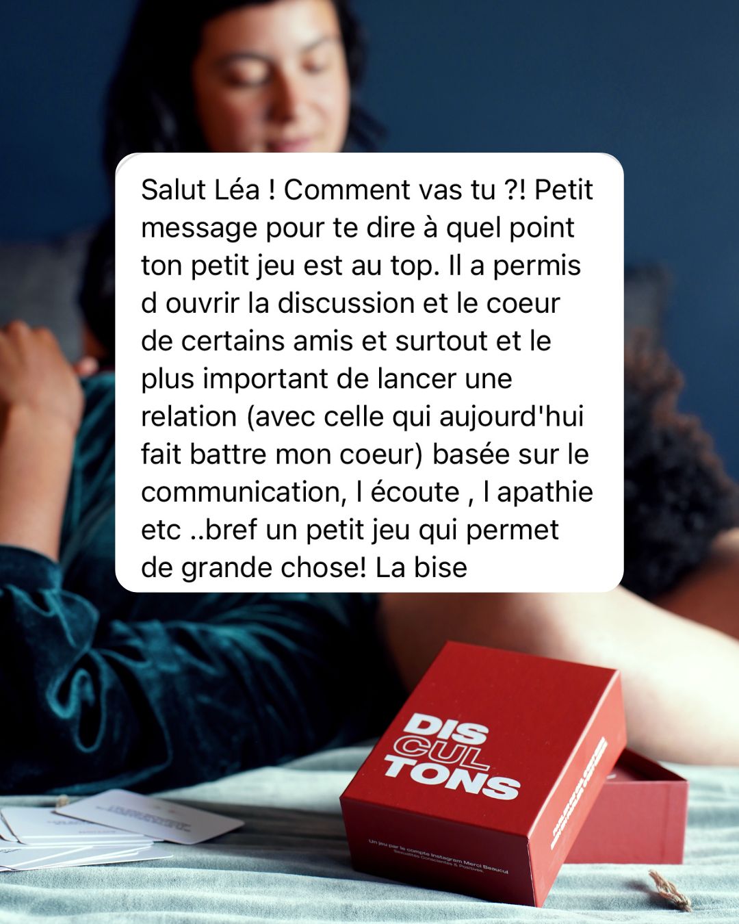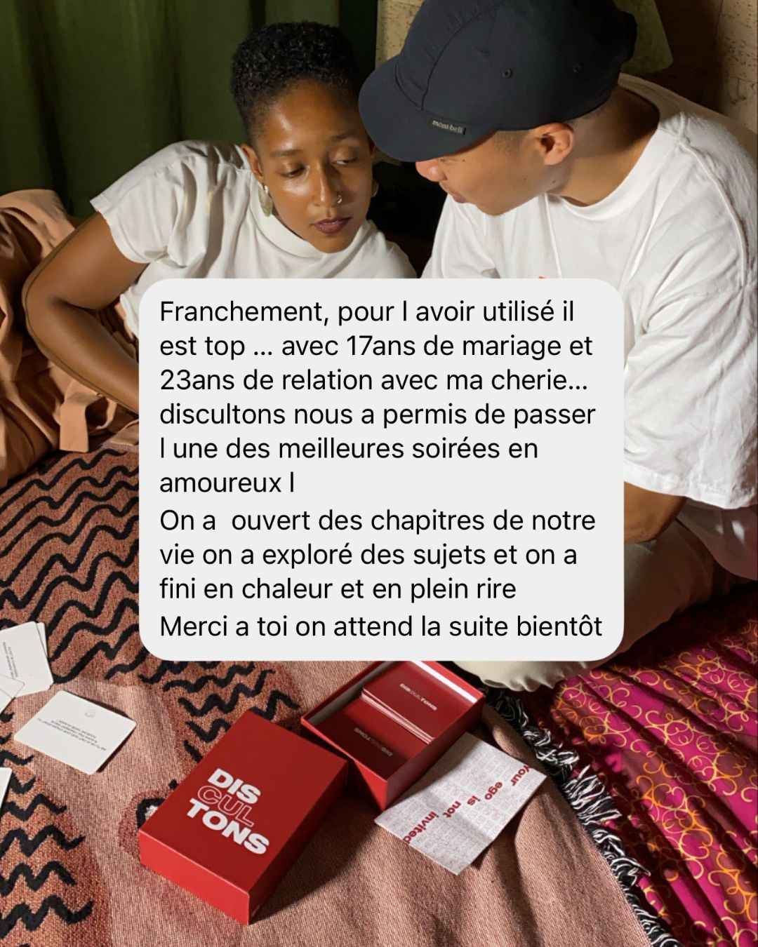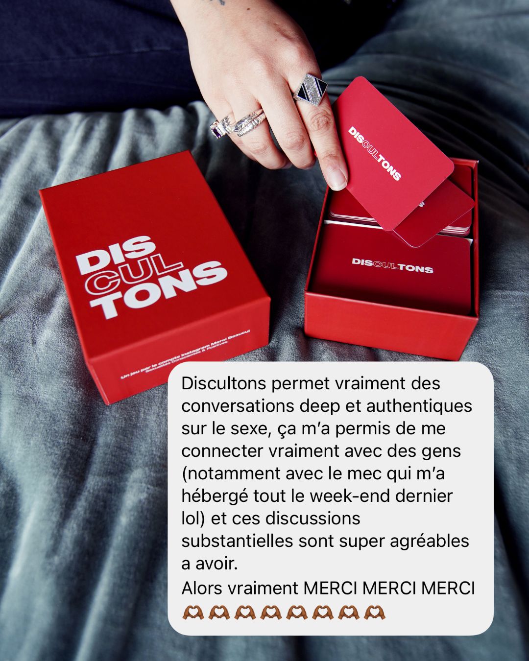 On vous a préparé une version digitale du jeu Discultons pour que vous puissiez tester le jeu. En terrasse avec vos ami.es ou avec votre partenaire, cette version mobile vous permet de prendre le jeu partout avec vous et toujours avoir un icebreaker sous la main.