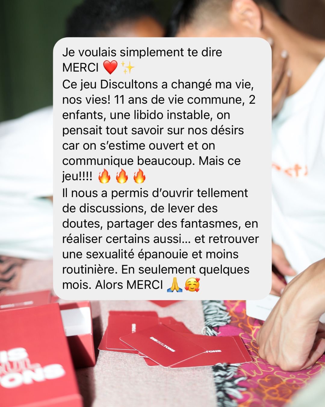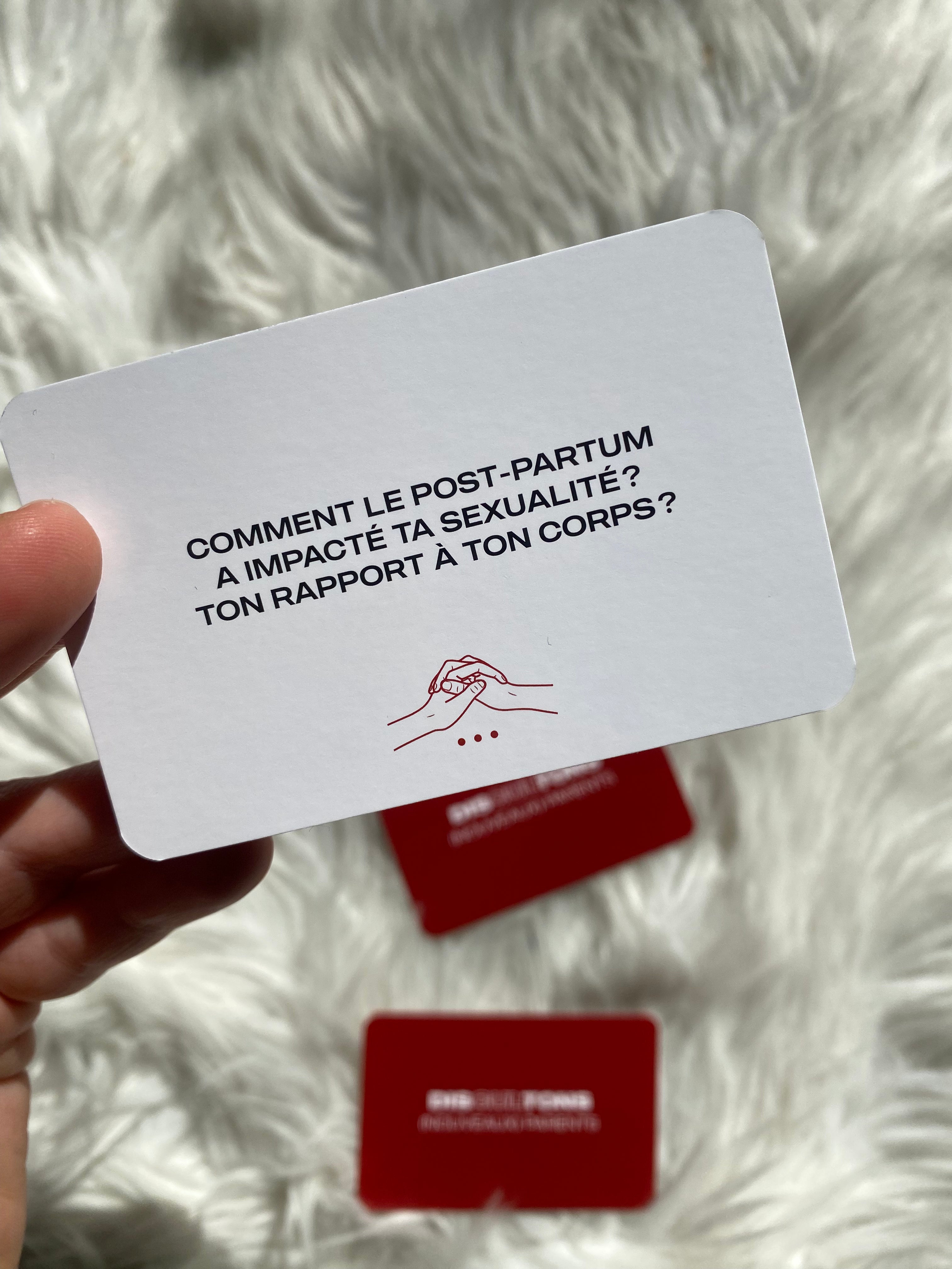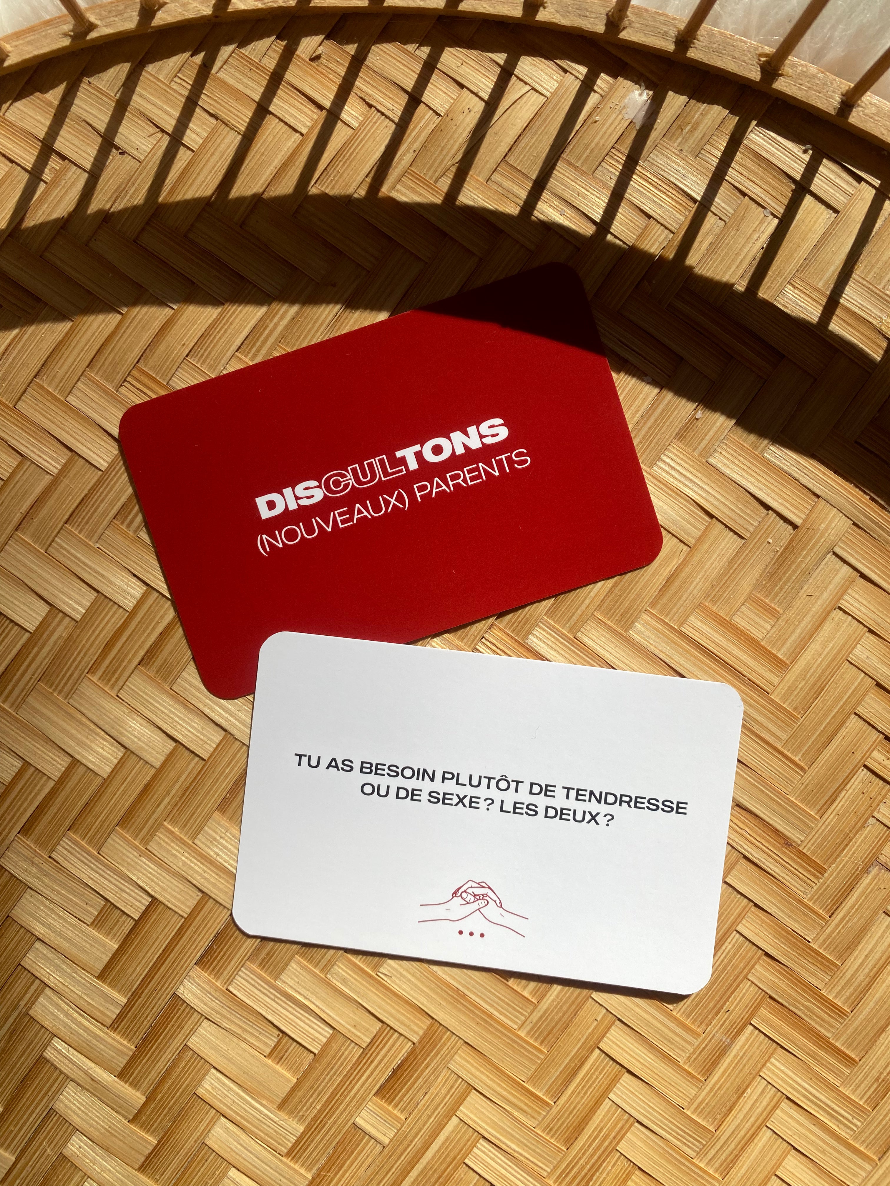 Cette édition spéciale du jeu Discultons, qui se concentre sur les questions intimes que rencontrent les couples après l’arrivée d’un enfant (corps, libido, fatigue…), contient 60 cartes avec :